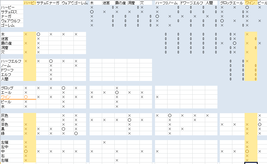 1.○のマスの縦軸=横軸 たとえば、「ハーピーはワイン好き」なので、