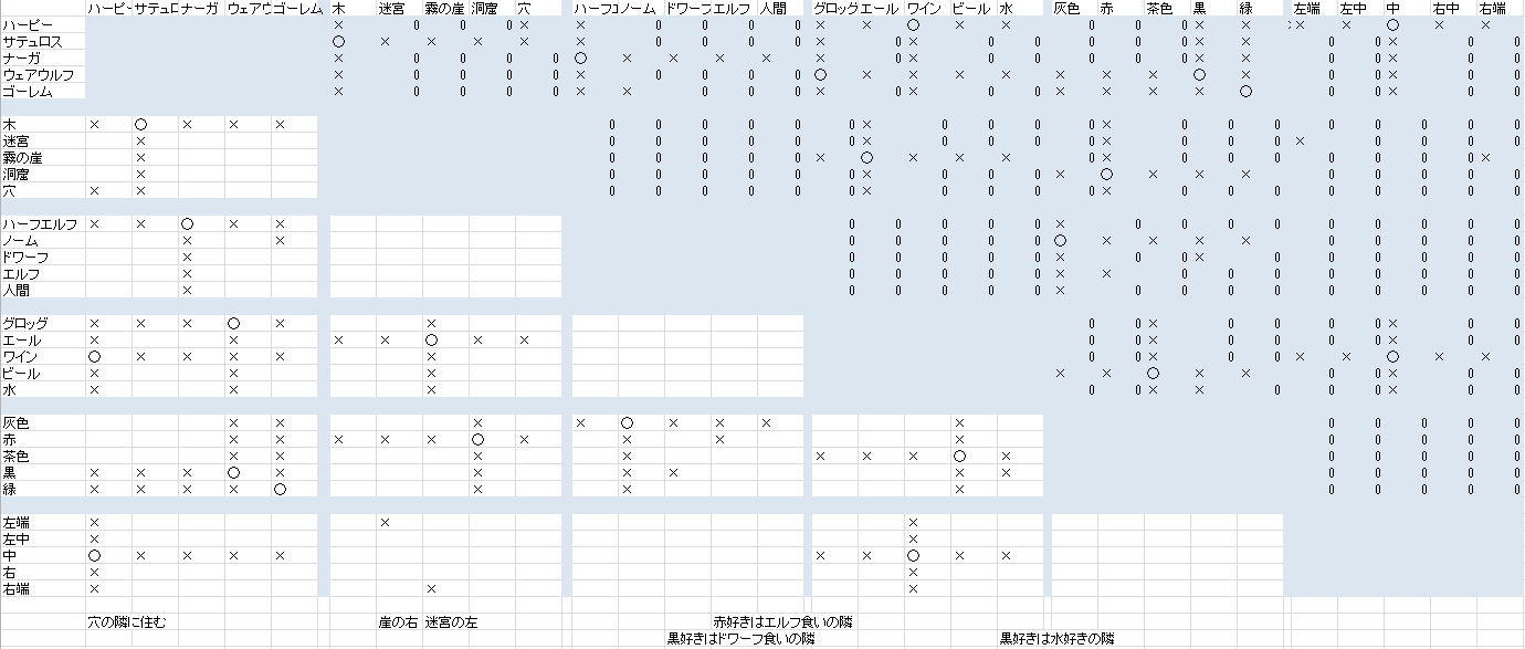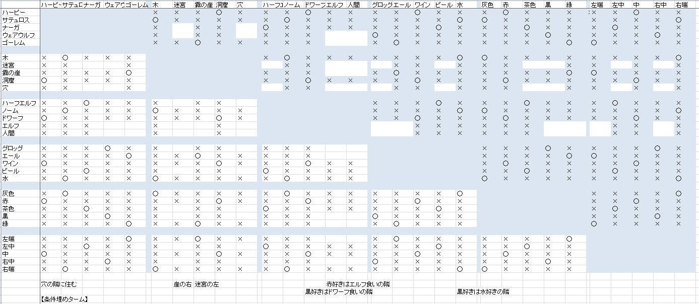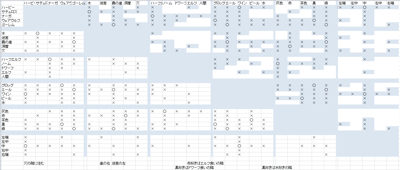 「黒好きは水好きの隣」では、現在の表から「水好きはノーム食いのサテュロス」ということが読み取れます。