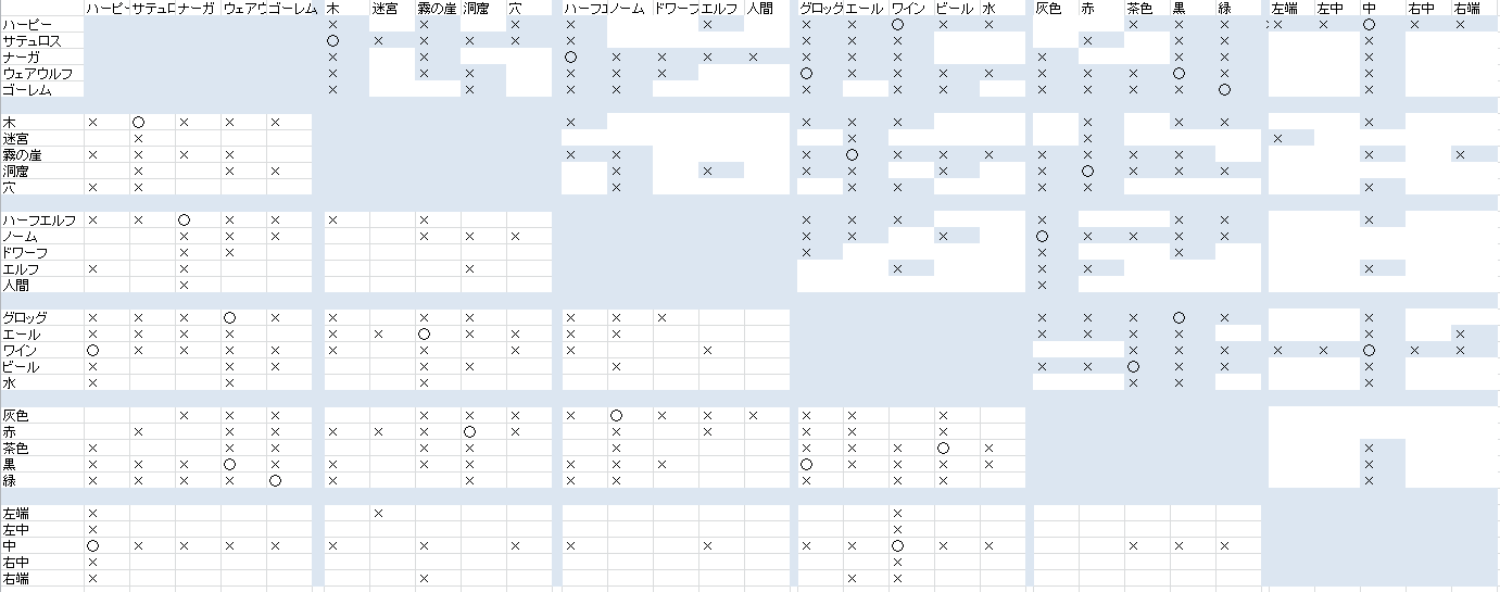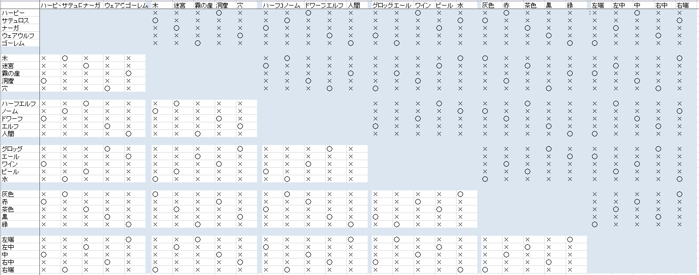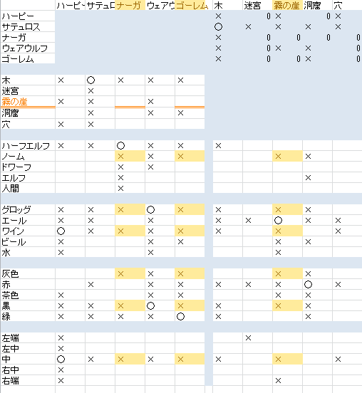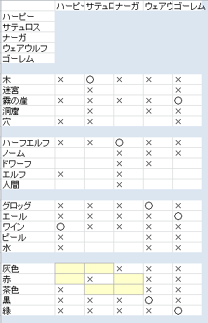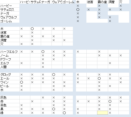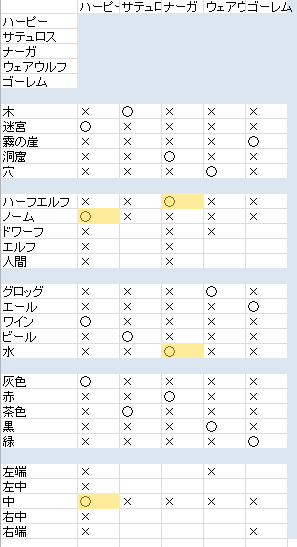 たとえば、表から「霧の崖に住む」のは「ナーガ」もしくは「ゴーレム」のどちらかだと読めます。