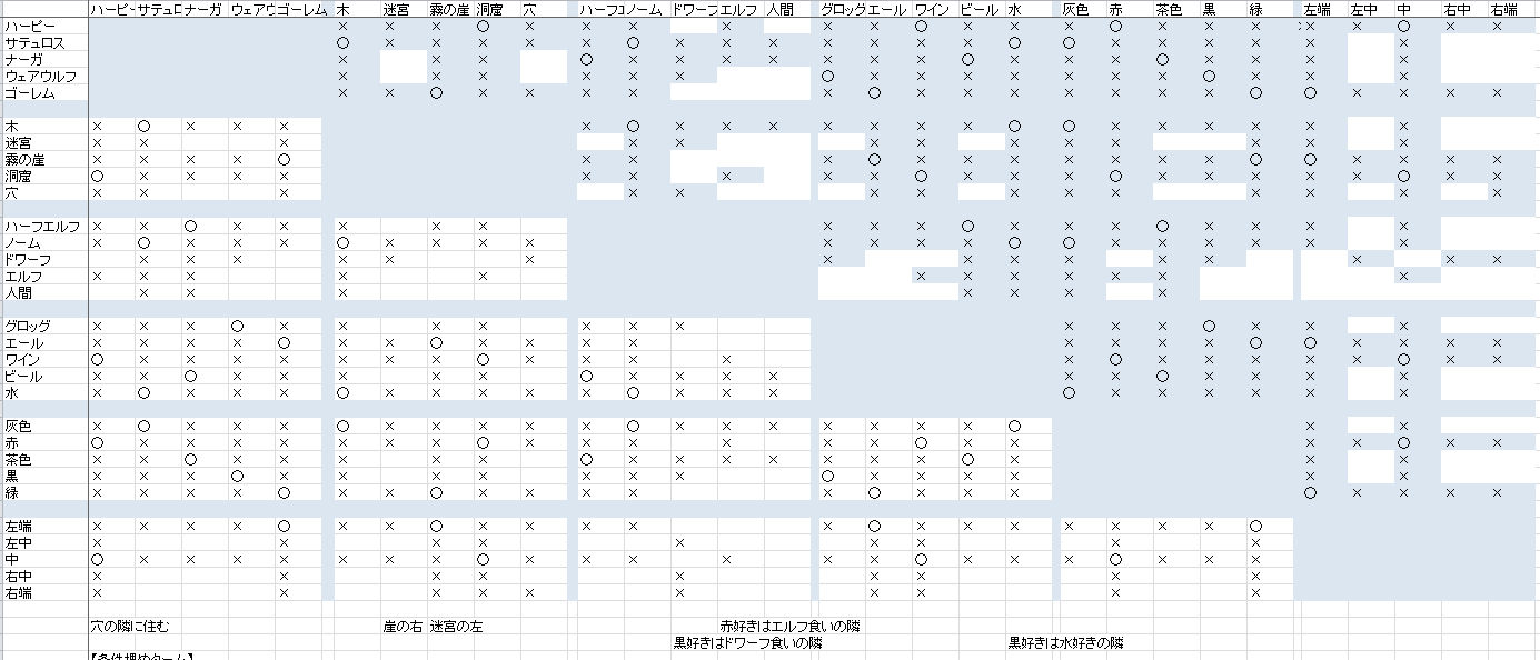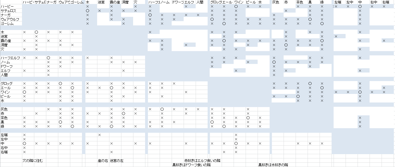 ※見づらかったので、右上青部分の未記入マスを白くしました3.表を見直す ここで「霧の崖に住む」者が好きな色のうち